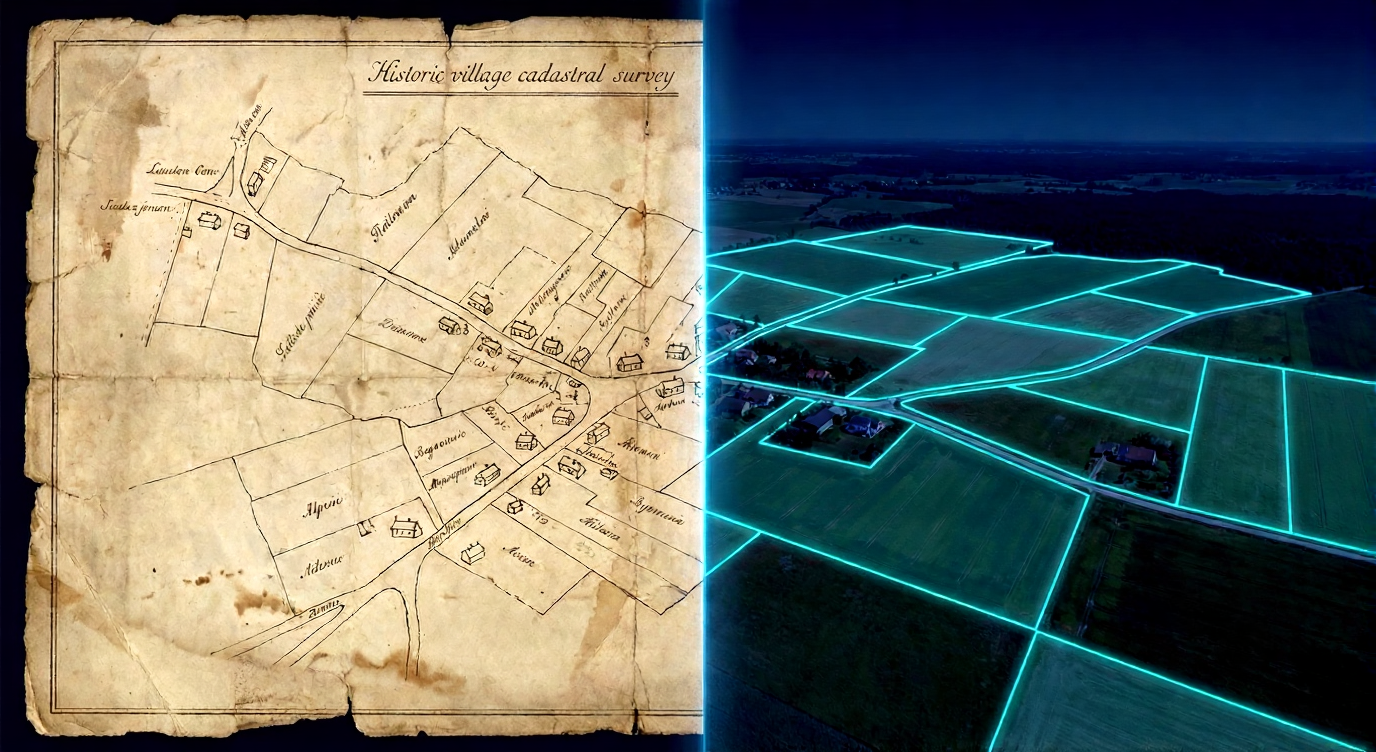 Aligning cadastral (ownership) maps with satellite imagery to judge and improve accuracy of land records.
